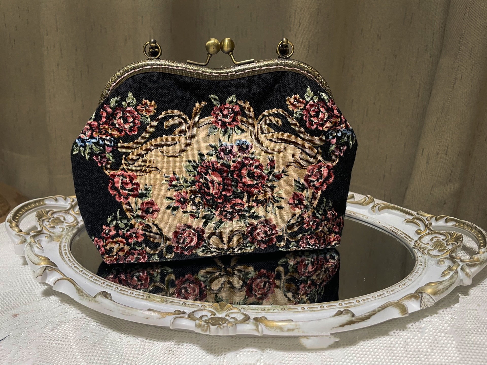 Lost in Vintage Thread Embroidered Bag Metal Handle Petitpoint Clutch Antique Kiss Lock Crossbody Kiss Lock Frame Evening Bag